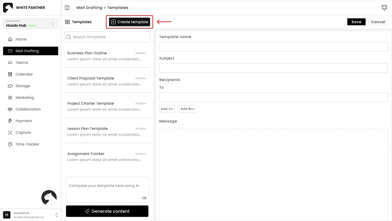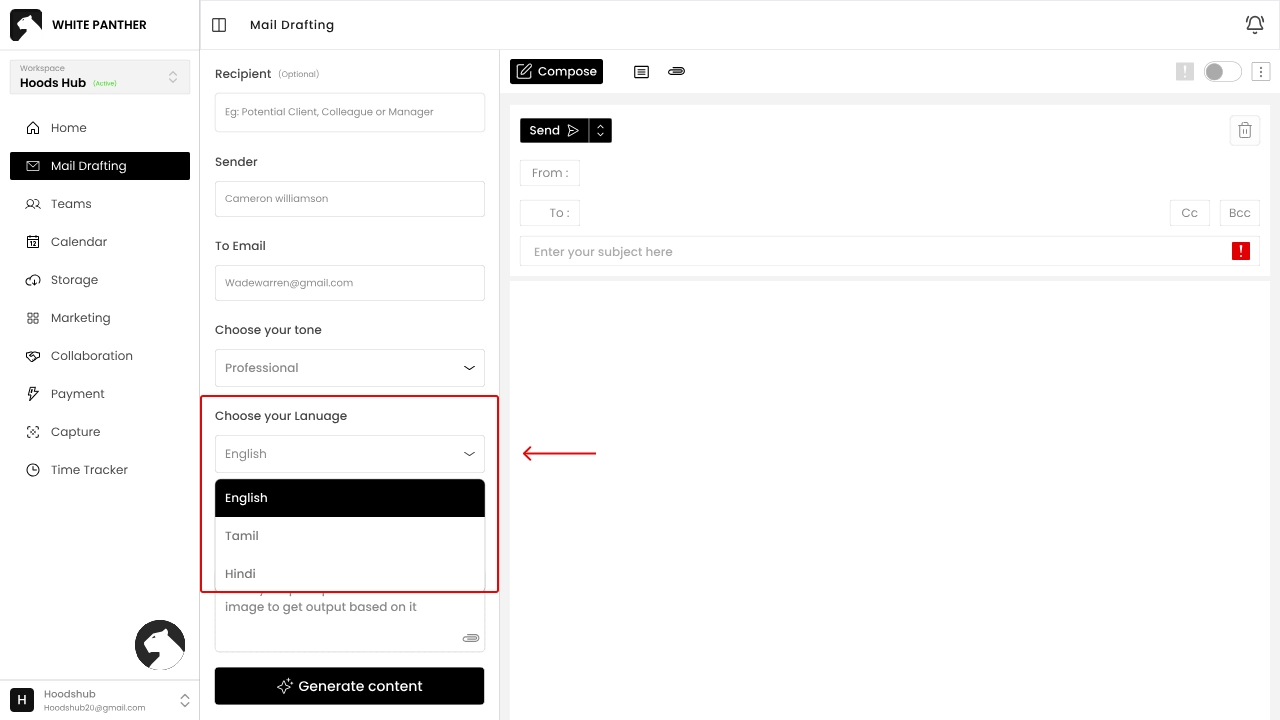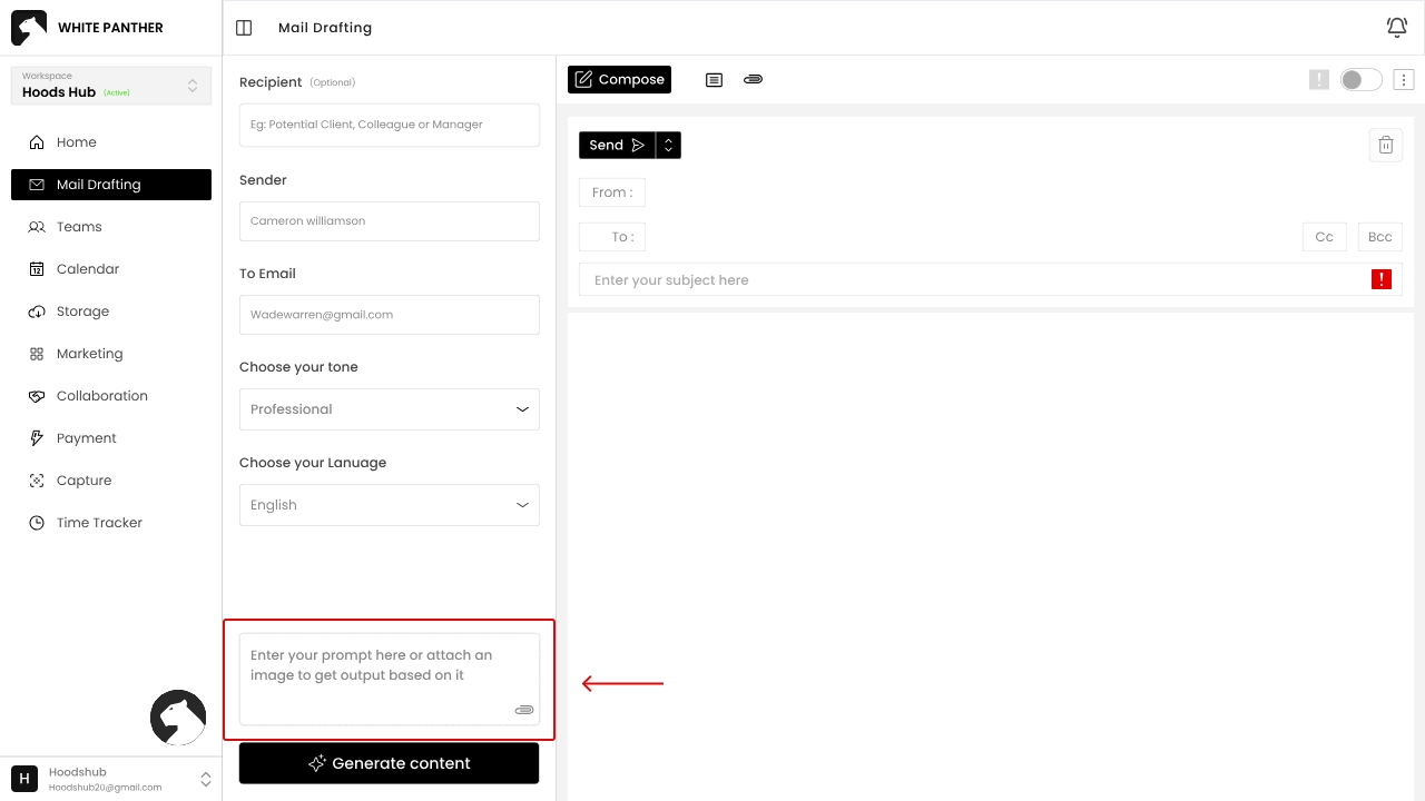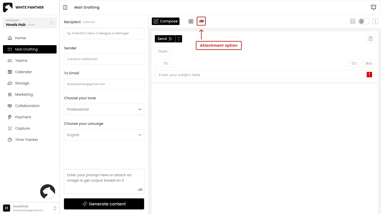 WhitePanther’s Mail Drafting feature lets you send emails from connected Gmail or Outlook accounts directly inside the platform. The compose window includes standard mail fields, AI-powered assistance and scheduling tools so you can write, attach files and send without leaving your workspace.