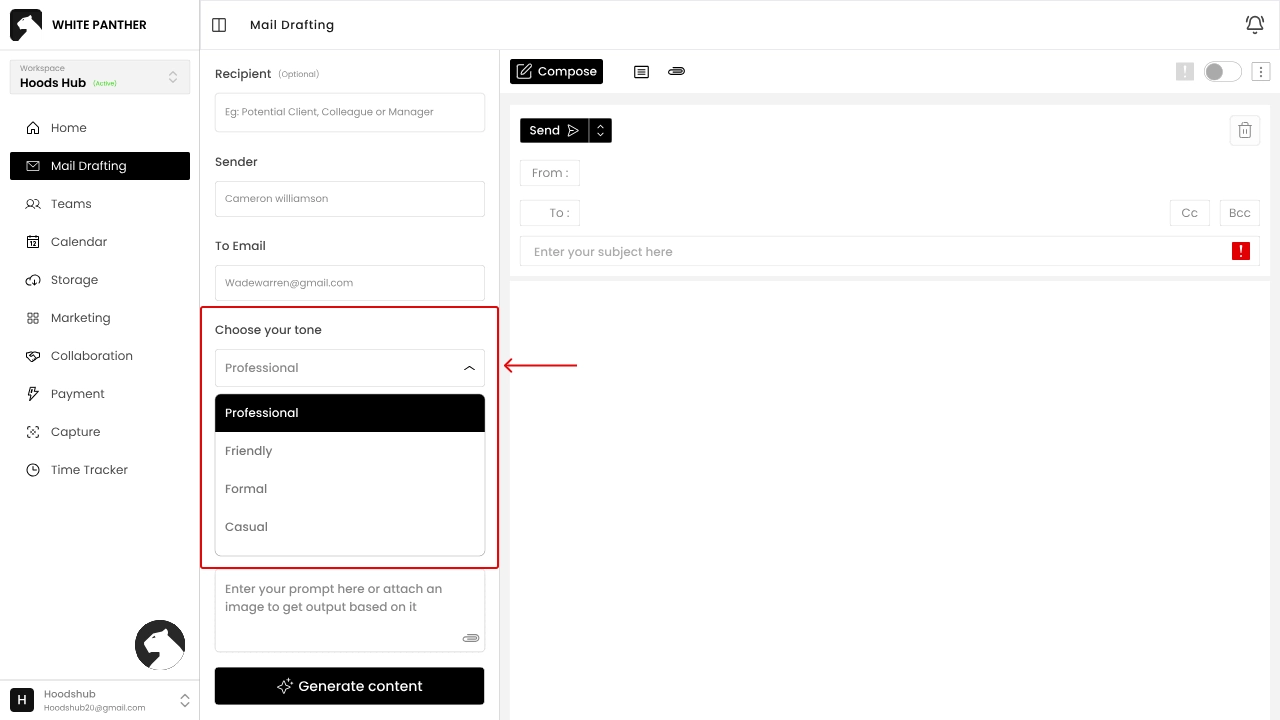 In the Mail Drafting page, locate the Choose your tone drop-down in the left panel. Click it and select a tone that matches your message, such as Friendly or Professional. The tone guides the AI on how formal or casual the generated content should be.