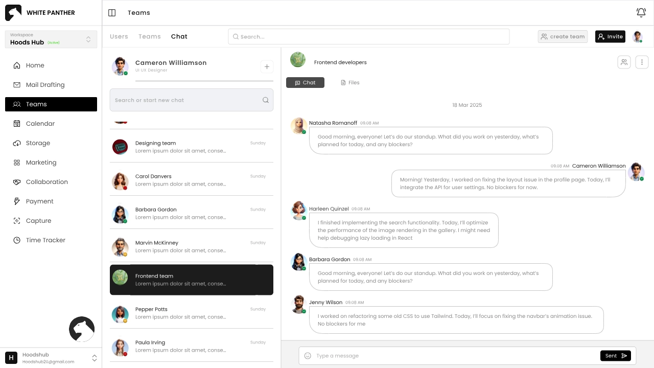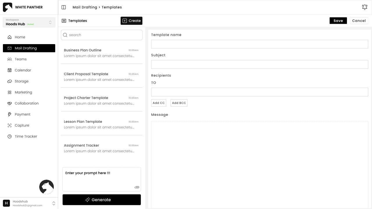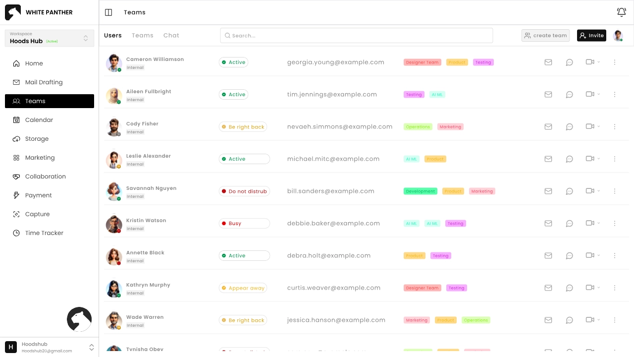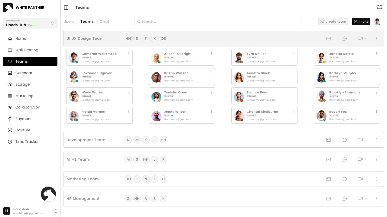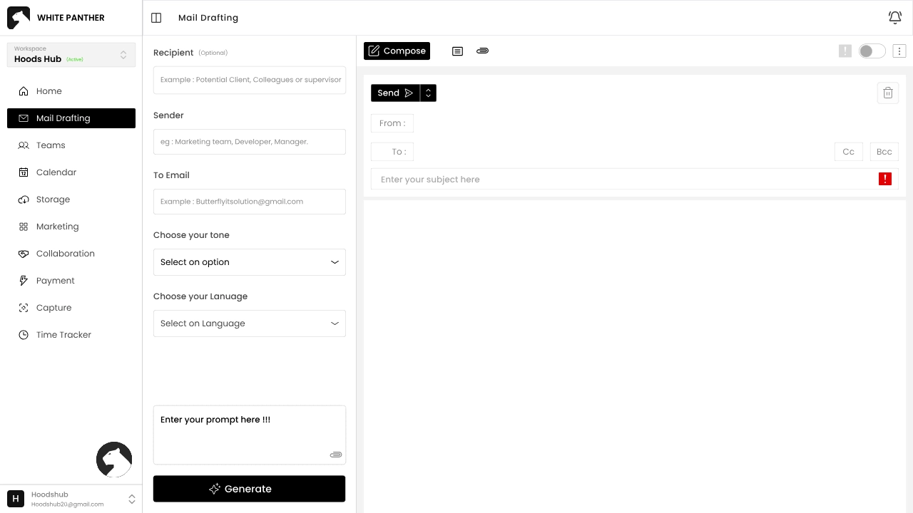 Once you complete these steps, White Panther opens to a chat‑like home interface. On the left navigation panel, you’ll see buttons for all White Panther’s features: Mail Drafting, Teams, Calendar, Storage, Marketing, Collaboration, Payments, Capture and Time Tracker.