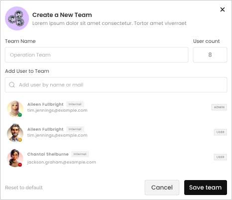 The Teams module lets you manage your organization’s members, create teams and chat with colleagues.