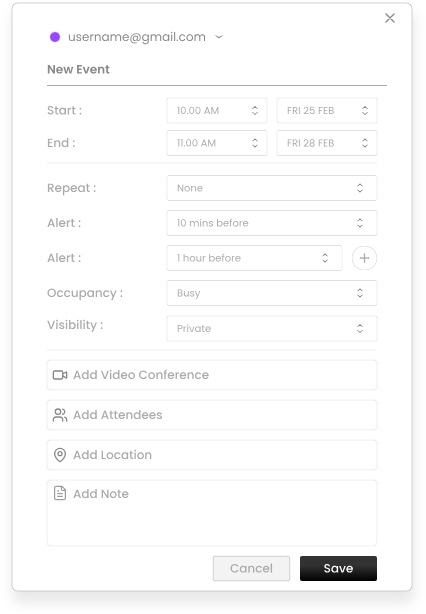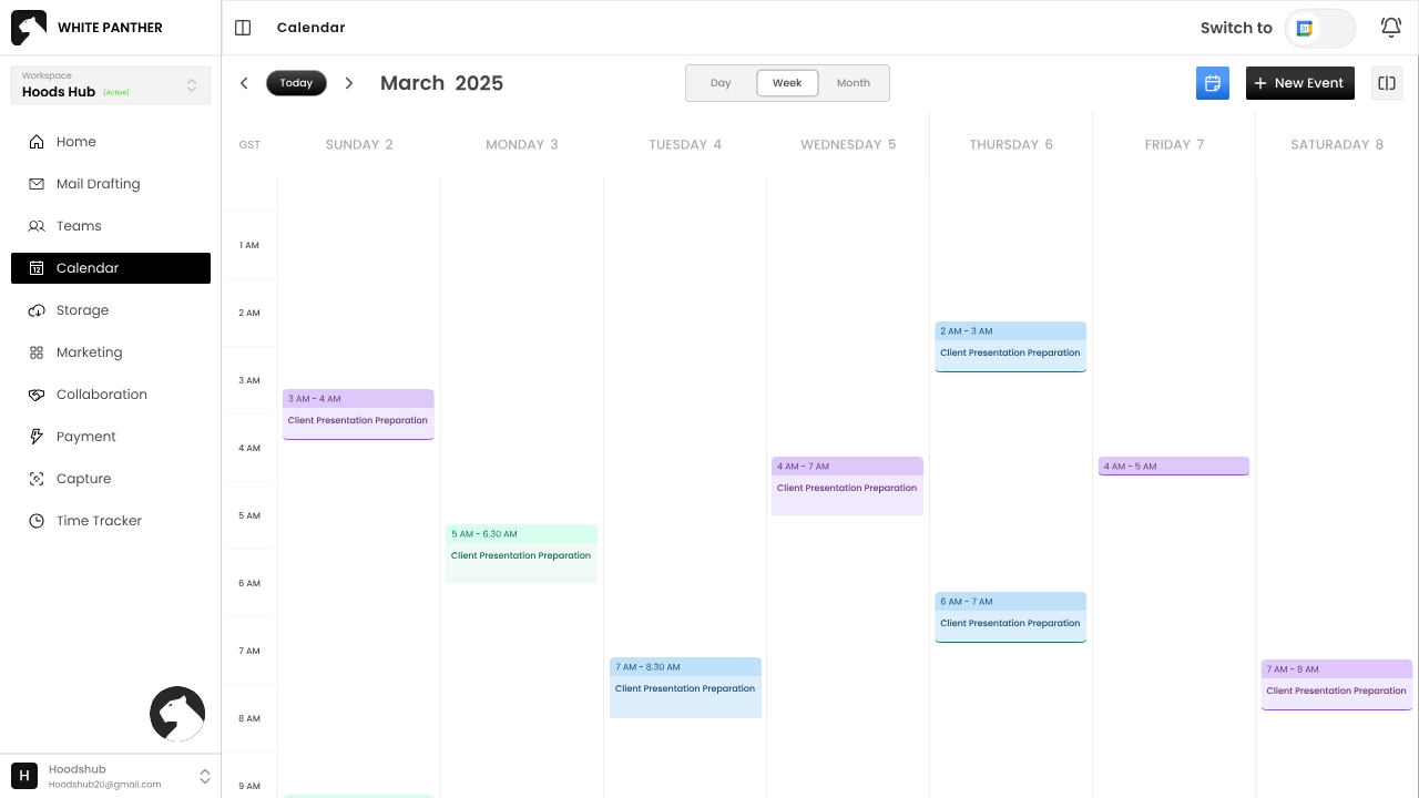 The Calendar feature integrates with your Google and Outlook calendars so you can manage your schedule without leaving White Panther.
