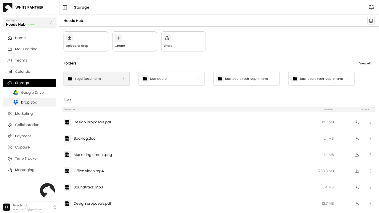 Storage consolidates your files from Google Drive and Dropbox directly inside White Panther. It supports uploading, creating folders and sharing documents.