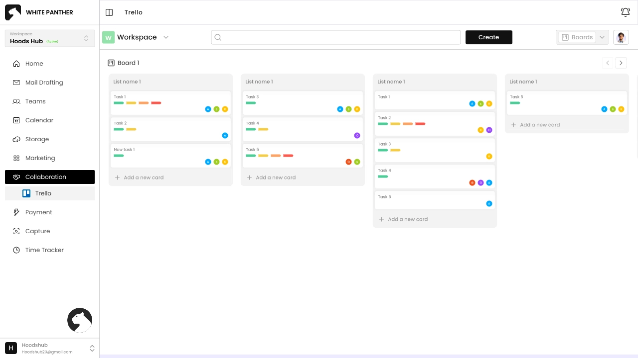 The Collaboration feature integrates Trello boards directly into White Panther so you can manage tasks without switching apps.