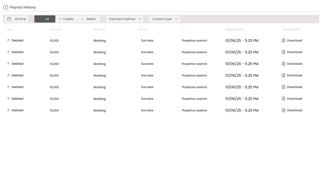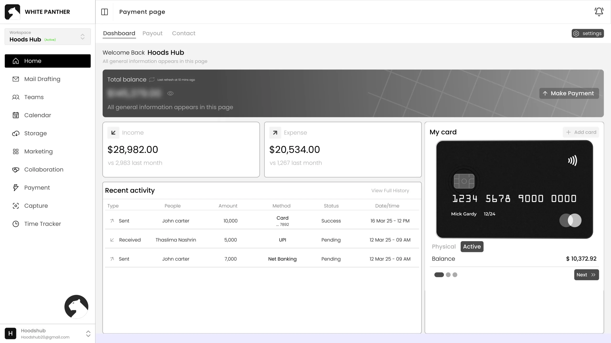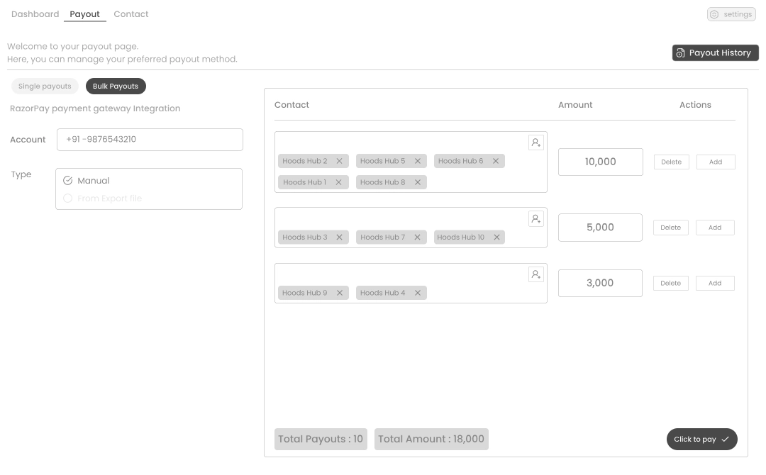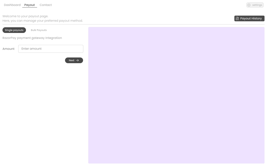 White Panther includes a Payment module powered by Razorpay for handling invoices, payouts and contact management.