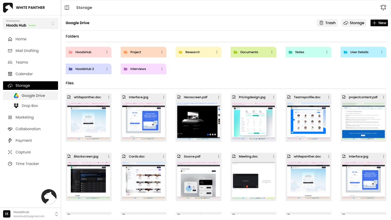 Storage consolidates your files from Google Drive and Dropbox directly inside White Panther. It supports uploading, creating folders and sharing documents.