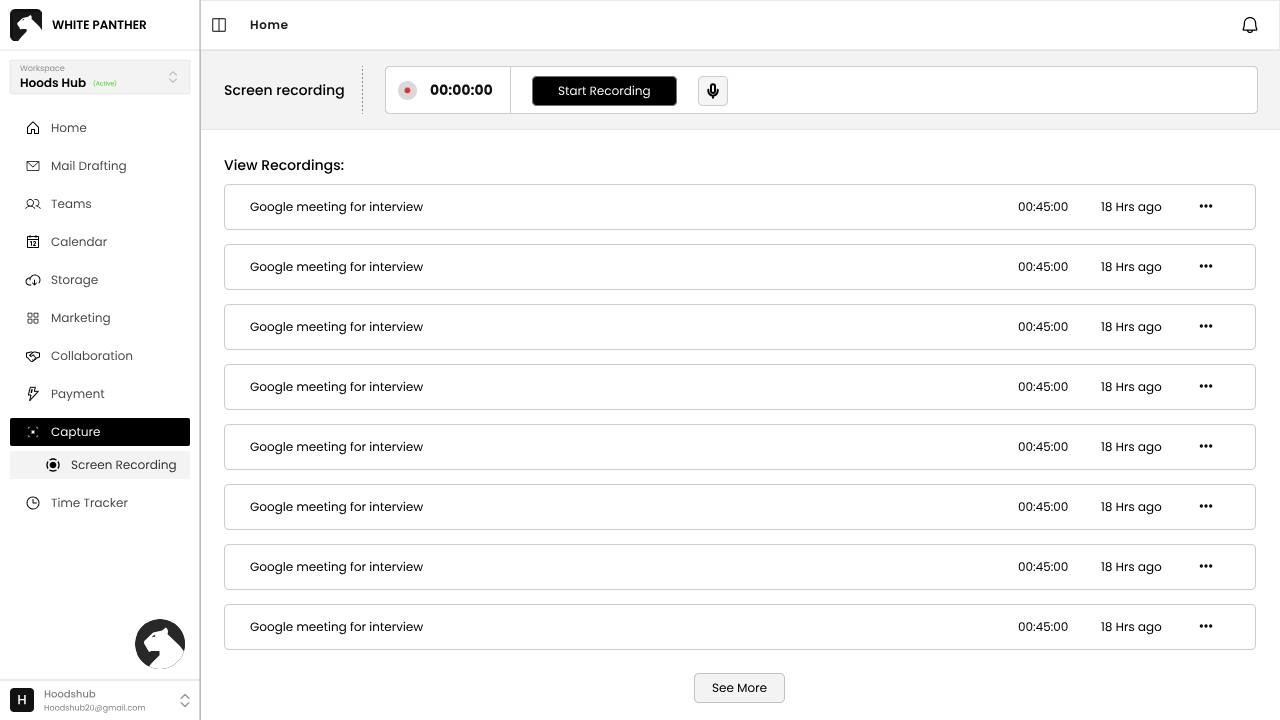 Once you complete these steps, White Panther opens to a chat‑like home interface. On the left navigation panel, you’ll see buttons for all White Panther’s features: Mail Drafting, Teams, Calendar, Storage, Marketing, Collaboration, Payments, Capture and Time Tracker.
