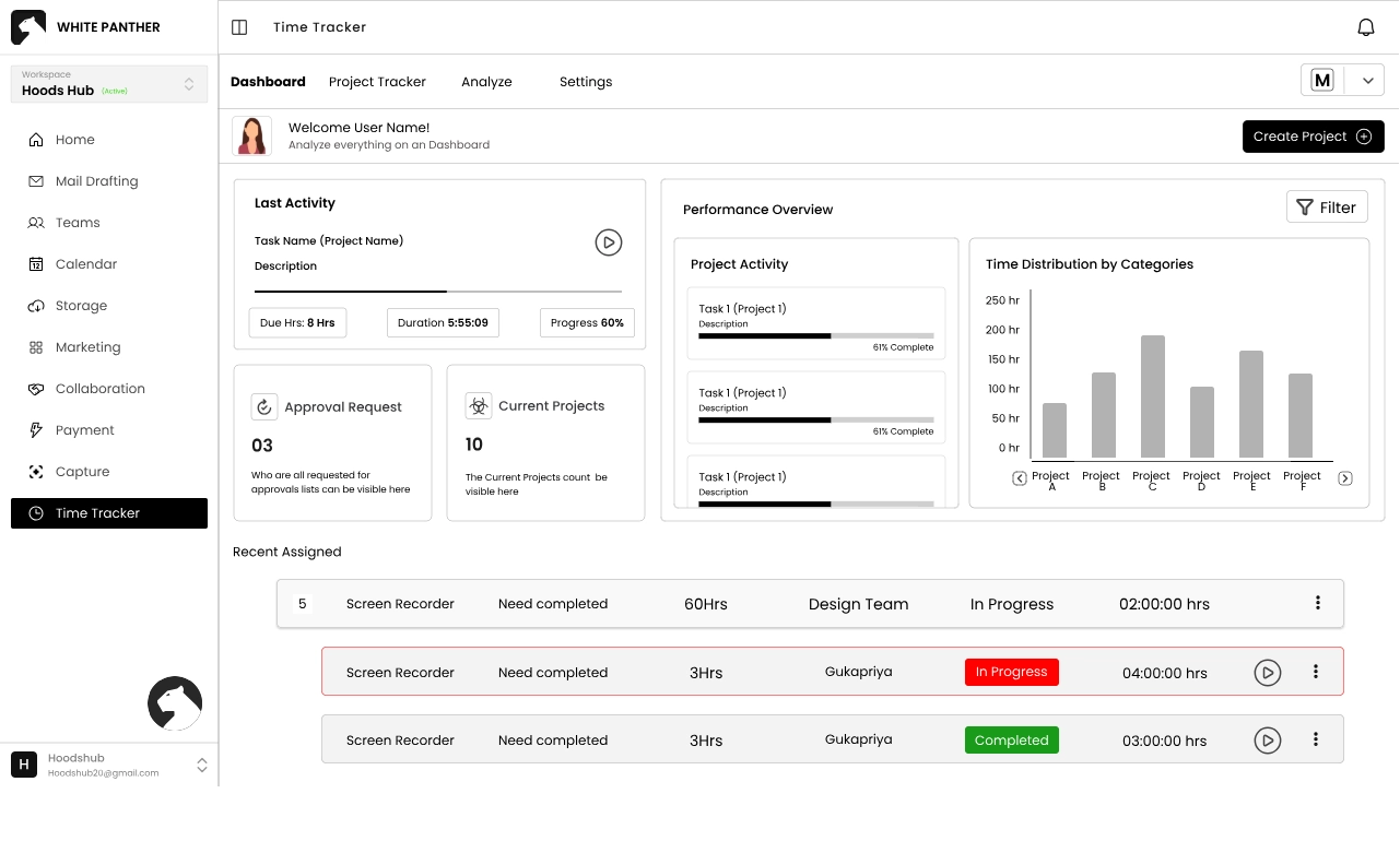 White Panther’s Time Tracker helps you log hours spent on tasks and projects, analyse productivity and integrate time data with calendars or project management tools.