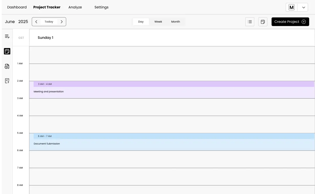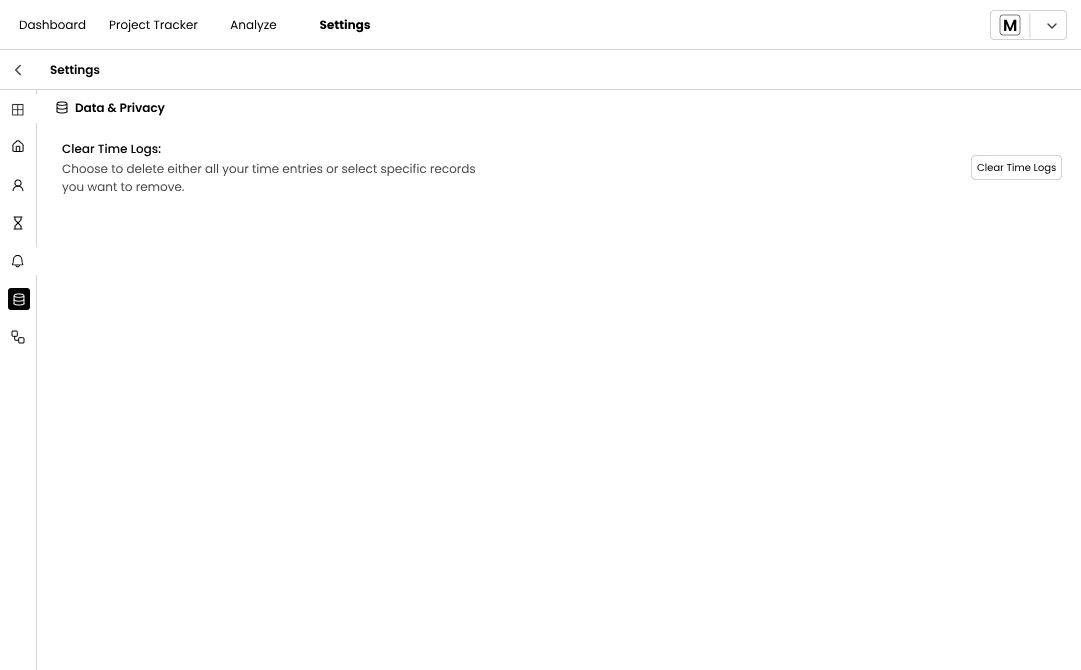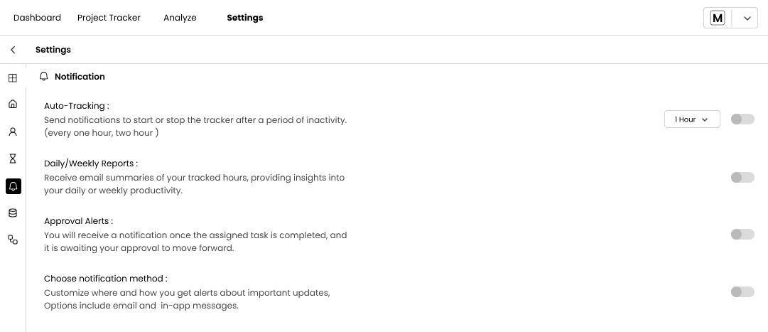 There are Four tabs in this feature: Dashboard, Project Tracker, Analyze and Settings.