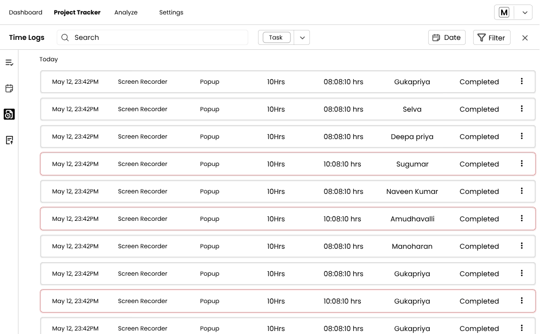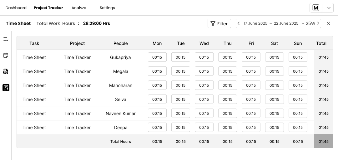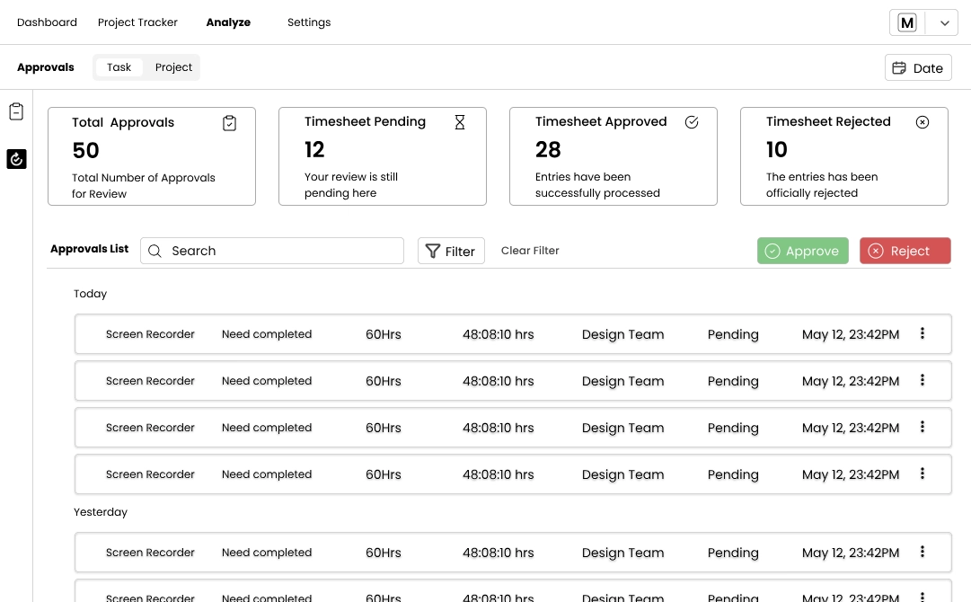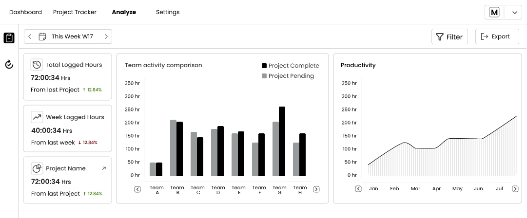 The Analyze tab summarises your team’s productivity, logged hours and approval statuses. ![]()
